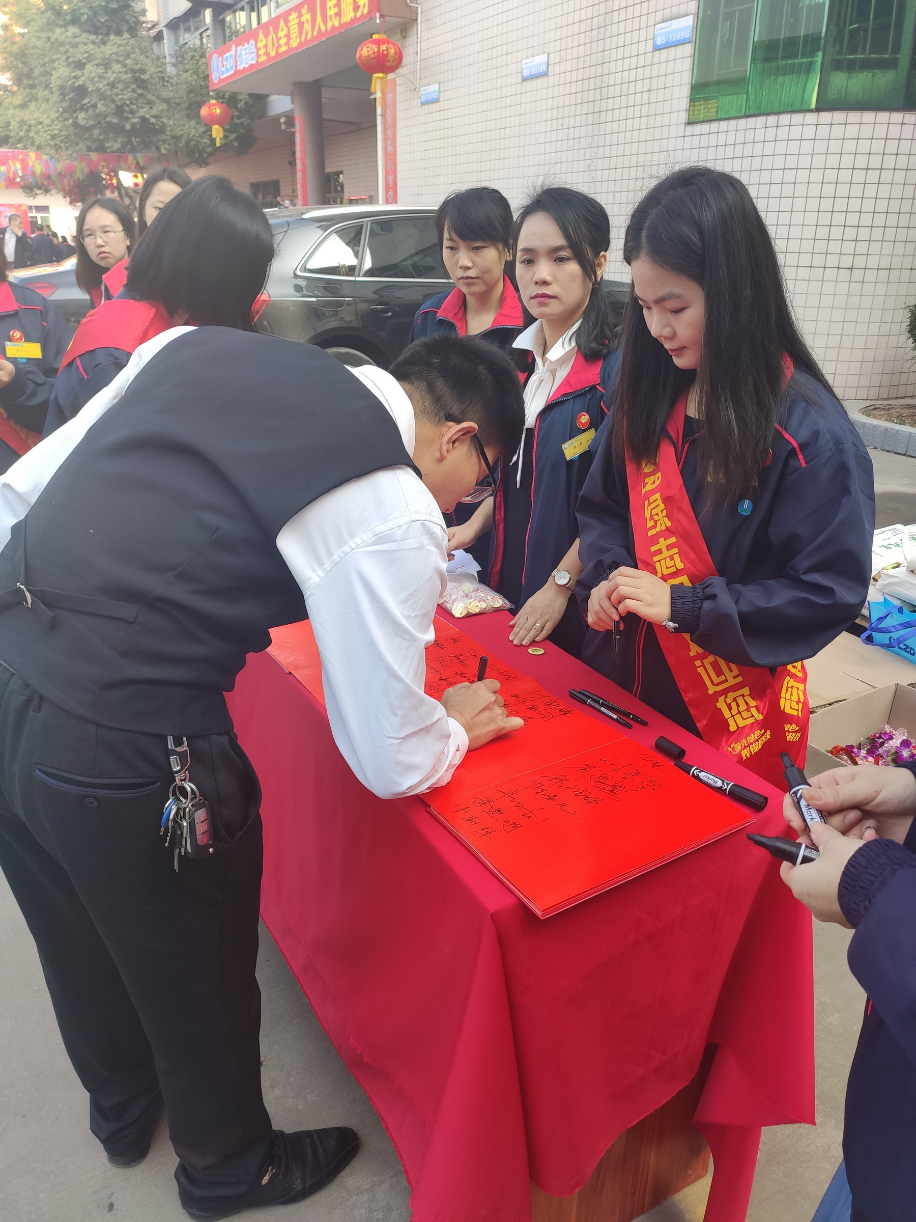 ▲迎賓人員為嘉賓佩戴毛主席像